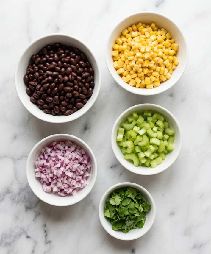 • Assemble the salad: In a large bowl, combine pasta, shredded chicken, beans, corn, onion, celery, and cilantro. Toss lightly.
