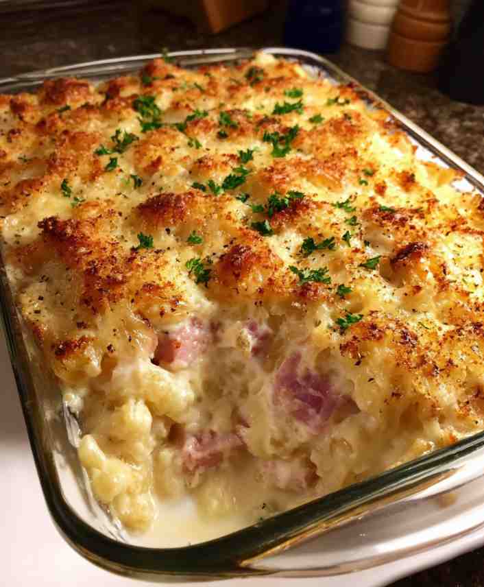 - Pour the creamy mixture over the chicken and ham, stirring gently until everything is coated.