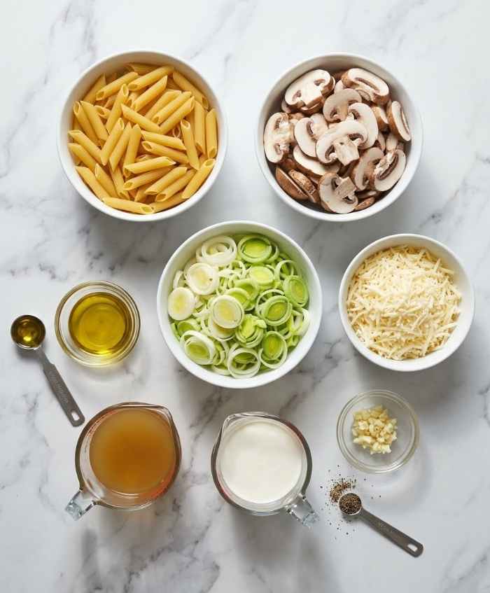 Ingredients for Caramelized Leek and Mushroom Gruyere Pasta
