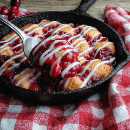 If you’ve got a can of biscuits, a jar of cherry pie filling, and a few pantry basics, dessert is basically ready. The cast iron gives it that nostalgic, old-fashioned crispness you just can’t fake and when you scoop it warm with a spoonful of vanilla ice cream melting down the side… well, you get it.