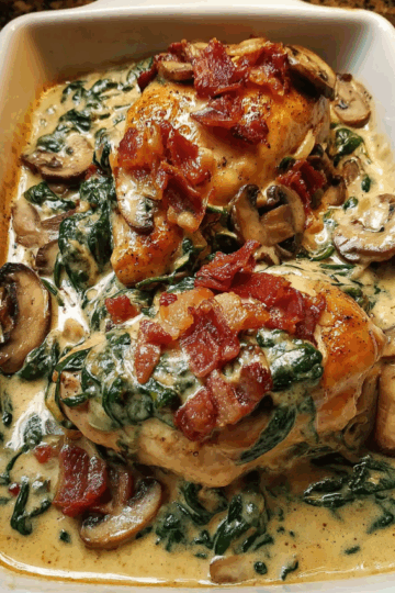 Smothered Chicken with Creamed Spinach, Bacon, and Mushrooms