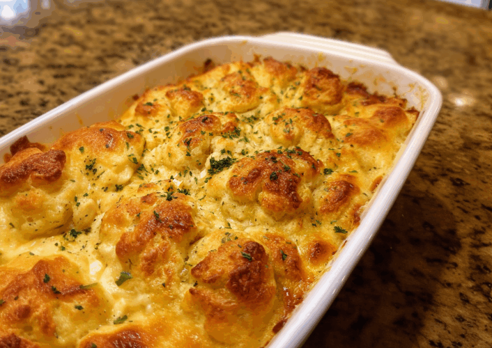 Think of it as chicken pot pie’s laid-back cousin: tender chicken, creamy sauce, golden biscuit topping made from the legendary Cheddar Bay mix. You basically layer, bake, and wait while magic happens. Perfect for weeknights, potlucks, or the kind of day when “comfort” feels like a food group.