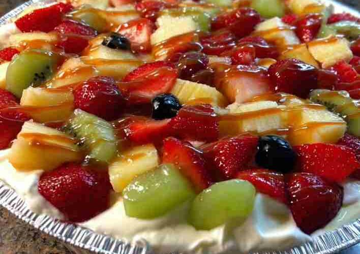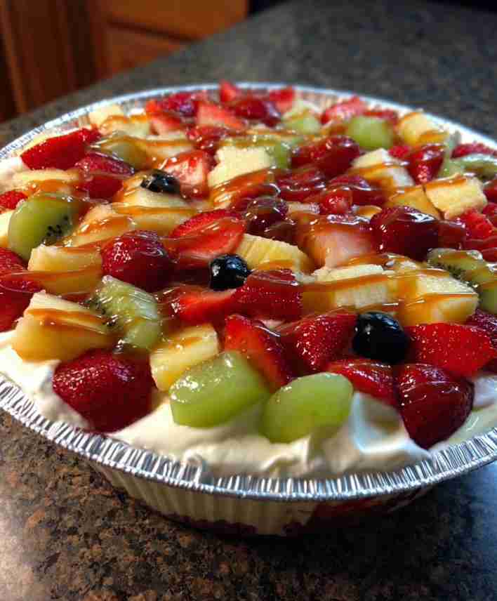 Cheesecake Fruit Salad with Creamy Filling and Caramel Drizzle