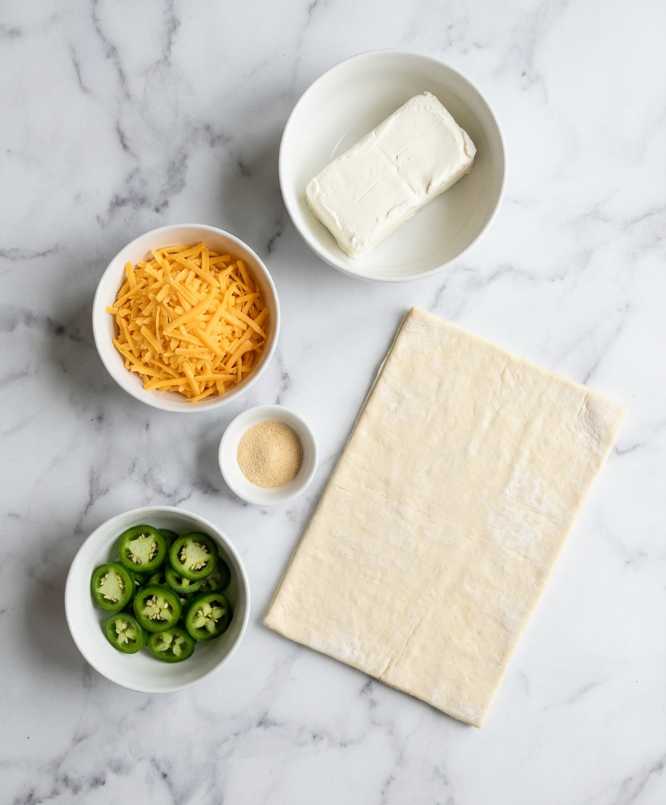 • In a bowl, mix cream cheese, shredded cheddar, jalapenos, and garlic powder until smooth.