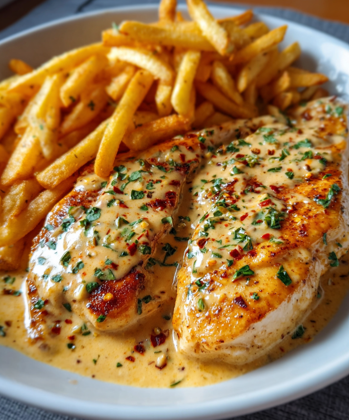 This Chicken Fillet in Spicy, Creamy Garlic-Parmesan Sauce with Fries is one of those meals rich, bold, and just indulgent enough to make any night feel like a mini celebration.
