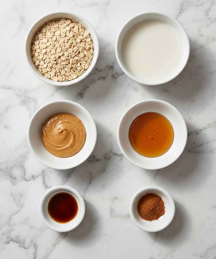 - Mix the base: In a medium bowl or mason jar, combine oats, milk, nut butter, maple syrup, vanilla, and cinnamon. Stir until everything looks smooth and creamy.