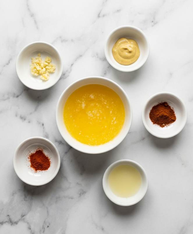 - In a small bowl, whisk together melted butter, garlic, Dijon mustard, smoked paprika, cayenne, lemon juice, honey, salt, and pepper.