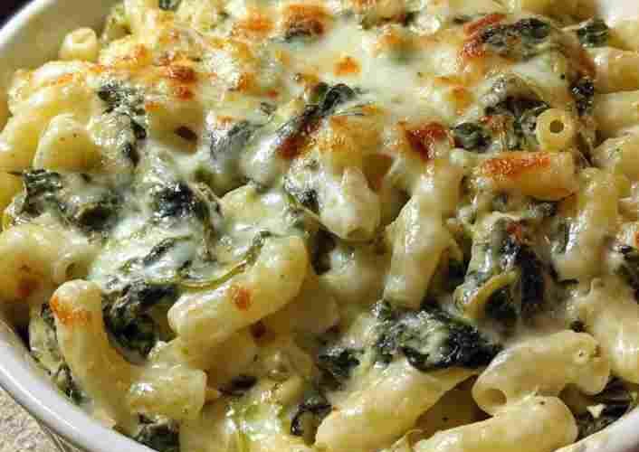 - Stir in the spinach, cheddar cheese, and Parmesan until melted and silky. Add mustard powder if using.