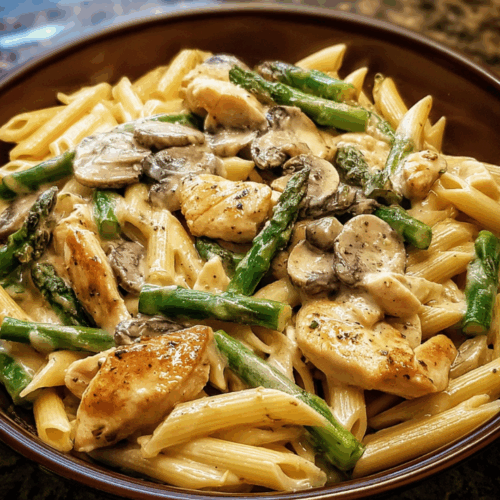 If you’ve ever craved something creamy, cozy, and deeply satisfying, but didn’t want to spend hours in the kitchen, this Creamy Mushroom and Asparagus Chicken Penne might just become your new midweek hero.