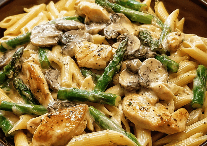 If you’ve ever craved something creamy, cozy, and deeply satisfying, but didn’t want to spend hours in the kitchen, this Creamy Mushroom and Asparagus Chicken Penne might just become your new midweek hero.