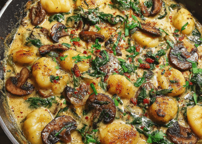 There’s something about a creamy, garlicky, one-pan meal that feels like a midweek miracle, especially when dinner looks (and tastes) like it came straight from a cozy Italian trattoria. This Creamy Spinach and Mushroom Gnocchi is exactly that: soft pillows of potato gnocchi bathed in a silky garlic cream sauce, tangled with sautéed mushrooms and fresh spinach.