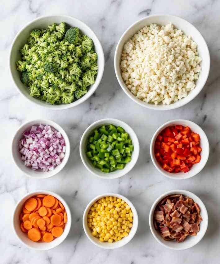 • Chop vegetables and cook bacon in advance for a faster assembly.