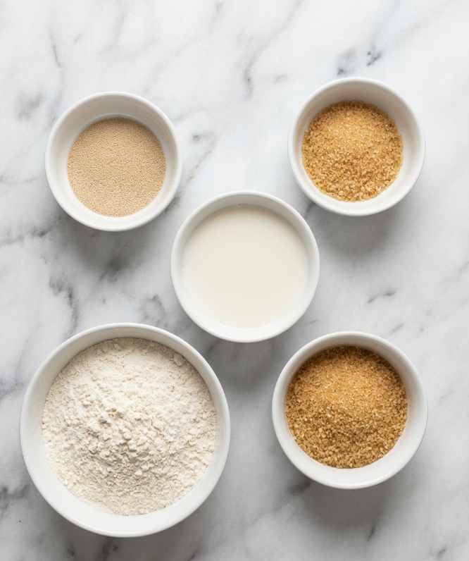 - In a small bowl, mix warm milk, yeast, and 1 tablespoon cane sugar. Let sit for 5–10 minutes until foamy.
