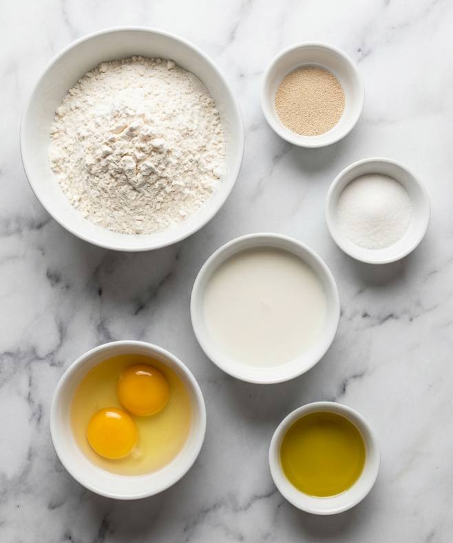 In a small bowl, mix warm milk with sugar. Sprinkle yeast on top and let sit for 5–10 minutes until foamy. - Prepare the Dough