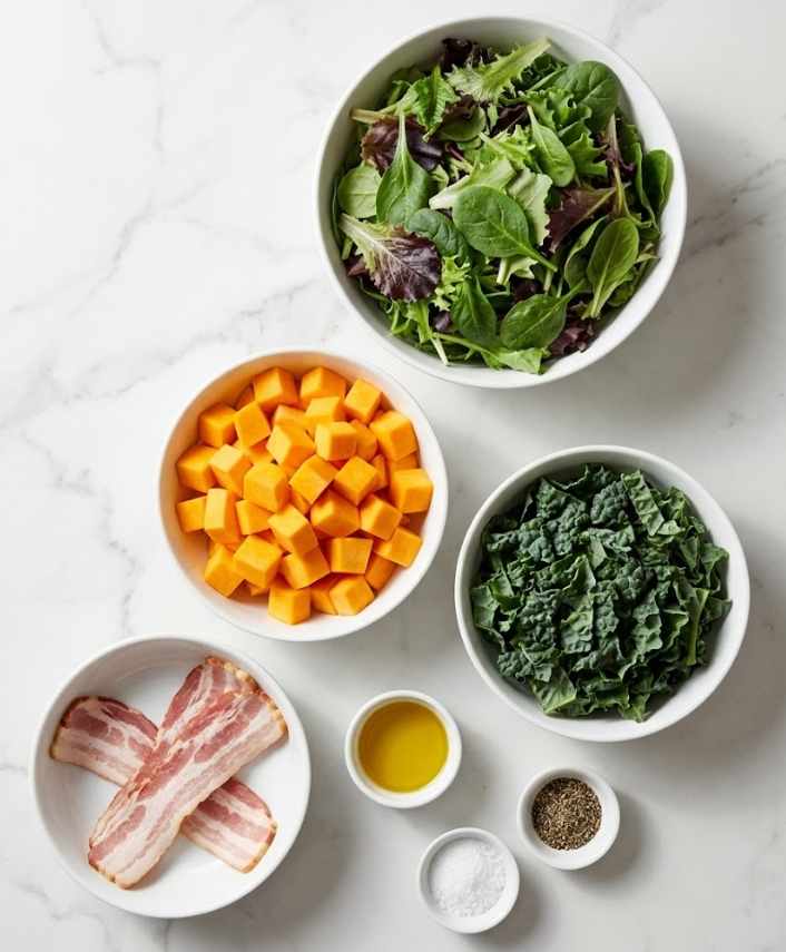 Preheat oven to 400°F (200°C). Toss the squash cubes with olive oil, ½ teaspoon salt, and ¼ teaspoon pepper on a baking sheet. Spread in a single layer and roast for 25–30 minutes, flipping halfway through, until golden and tender. - Cook the bacon.
