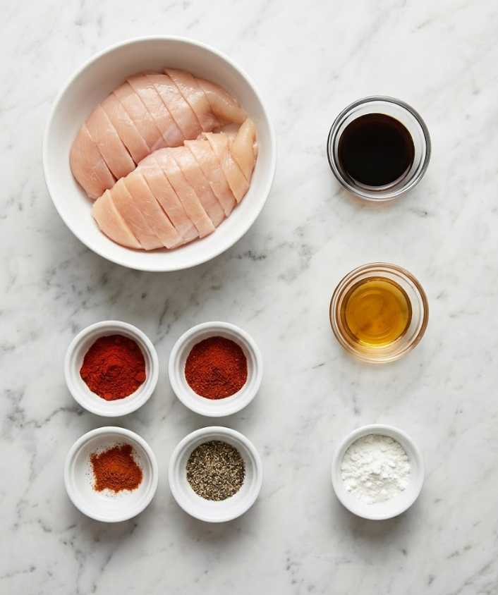 In a mixing bowl, whisk together soy sauce, sesame oil, cornstarch, smoked paprika, chili powder, cayenne, and black pepper. Add sliced chicken and toss until fully coated. Let it rest for about 10 minutes while you prep the sauce.