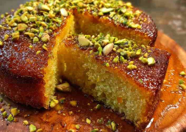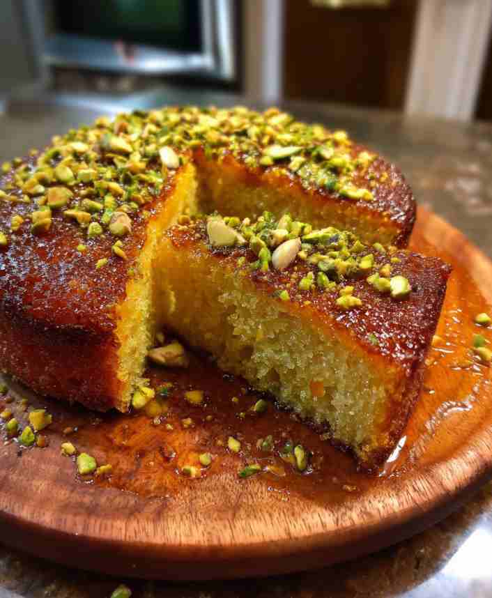 Let the cake cool fully in the pan before transferring to a serving plate. Dust with powdered sugar and garnish with pistachios before serving.