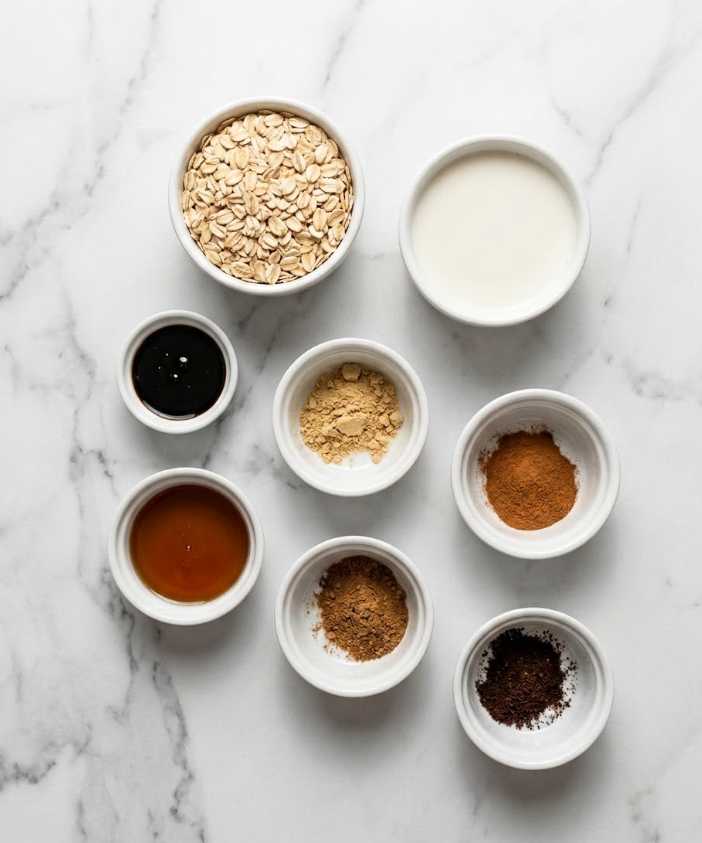 - In a jar or bowl, combine oats, milk, molasses, maple syrup, ginger, cinnamon, cloves, and vanilla extract.