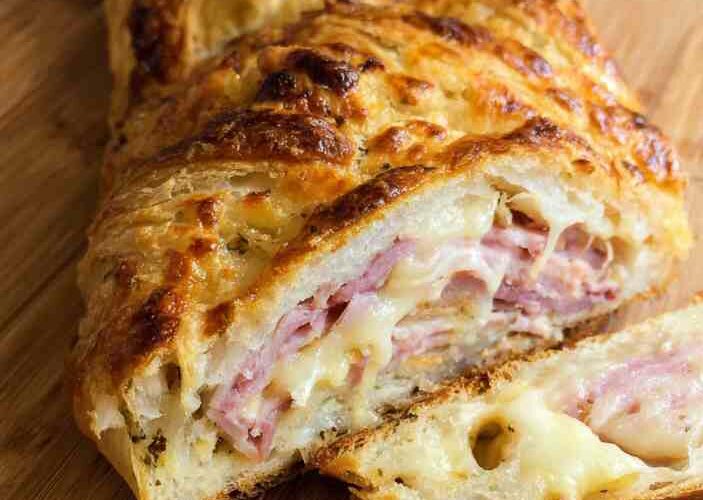 - Stretch dough into a large rectangle. Scatter most of the cheese and ham evenly across the surface, fold the dough over itself, add remaining filling, and gently shape into a loaf.