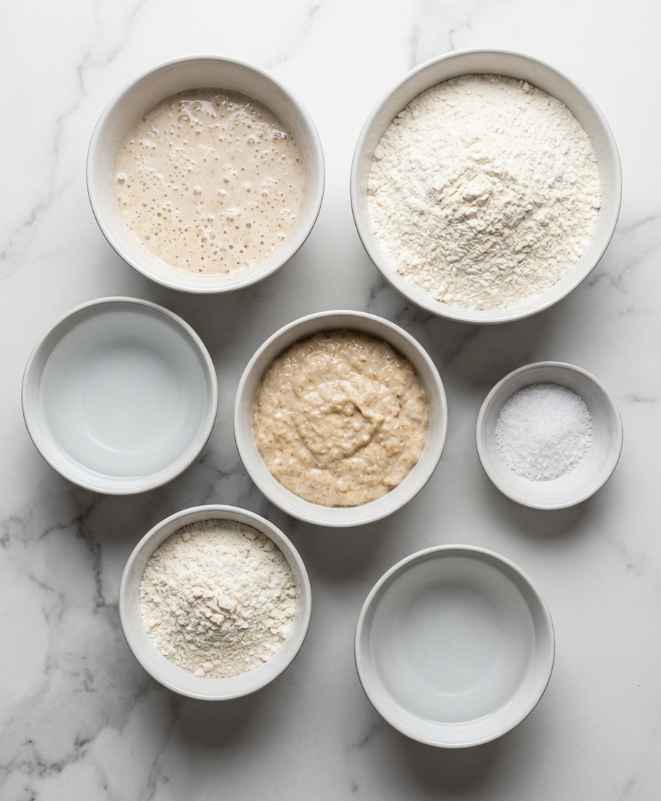 - Mix sourdough starter, flour, and water until combined. Cover loosely and ferment at warm room temperature until doubled and bubbly.