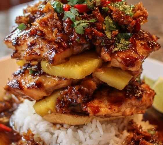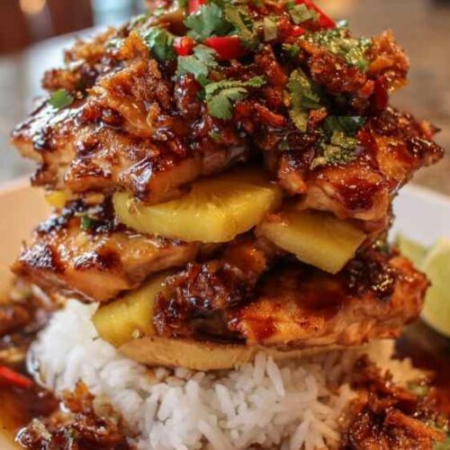 Bright, tropical flavors meet hearty comfort in this Hawaiian Huli Huli Chicken Stack. Juicy pineapple-marinated chicken is grilled until caramelized, then layered over fluffy jasmine rice and finished with fresh fruit, creamy avocado, and a splash of lime. This vibrant dish delivers sweet, savory, and smoky notes in every bite—perfect for weeknight dinners, summer gatherings, or whenever you want island-inspired flavor at home.