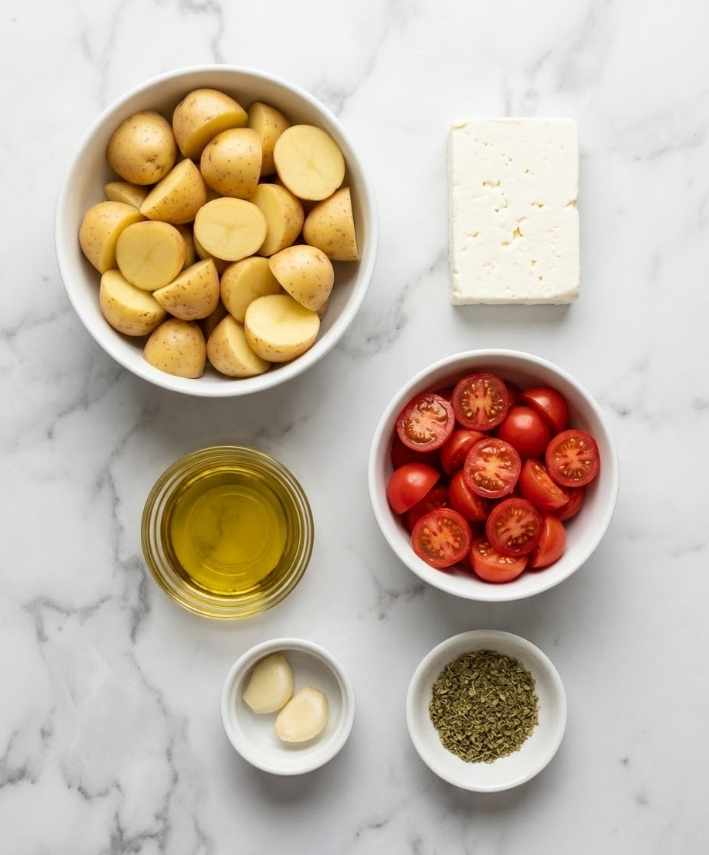 - Preheat and PrepPreheat the oven to 400°F (200°C). Rinse and cut the potatoes so they’re roughly even in size — smaller pieces roast more evenly.In a large baking dish (9×13-inch works perfectly), combine the potatoes, cherry tomatoes, garlic, olive oil, oregano, black pepper, and a pinch of salt. Toss until everything is glossy and evenly coated.