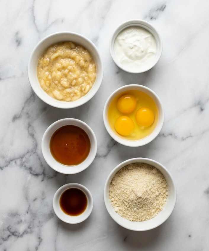 • Mix Wet Ingredients: In a large bowl, whisk together mashed bananas, yogurt, eggs, maple syrup, and vanilla until smooth.
