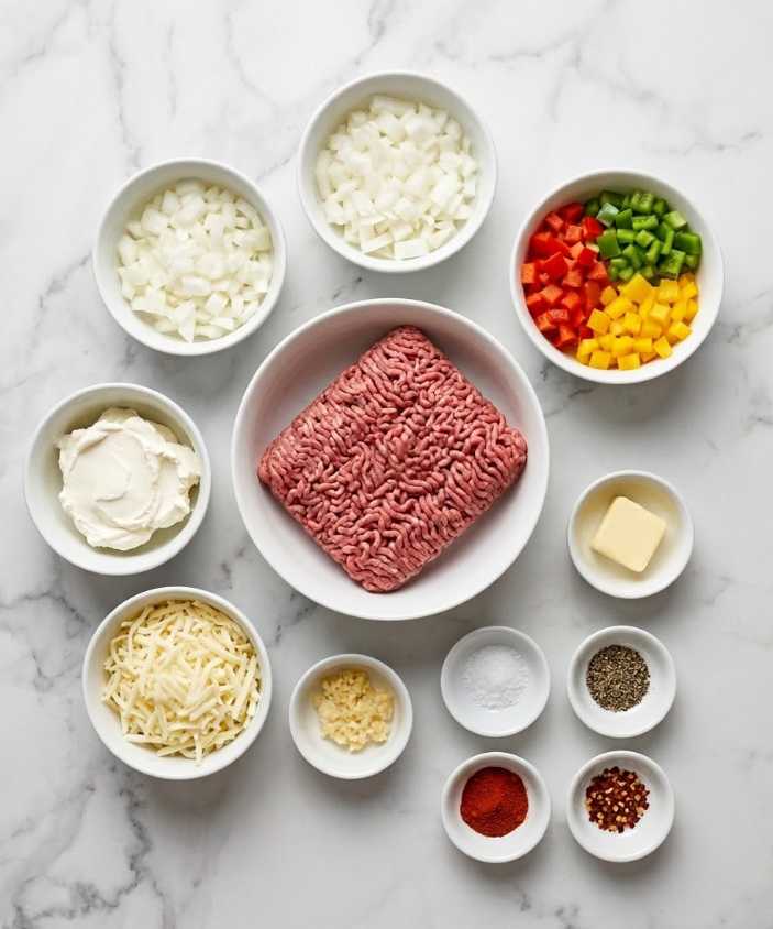 Ingredients for High-Protein Philly Cheesesteak Mac & Cheese