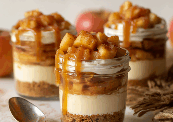 This no-bake Mason Jar Apple Pie layers graham cracker crust, creamy vanilla filling, and warm cinnamon apples with caramel drizzle — a cozy fall dessert you can gift or enjoy on the go.