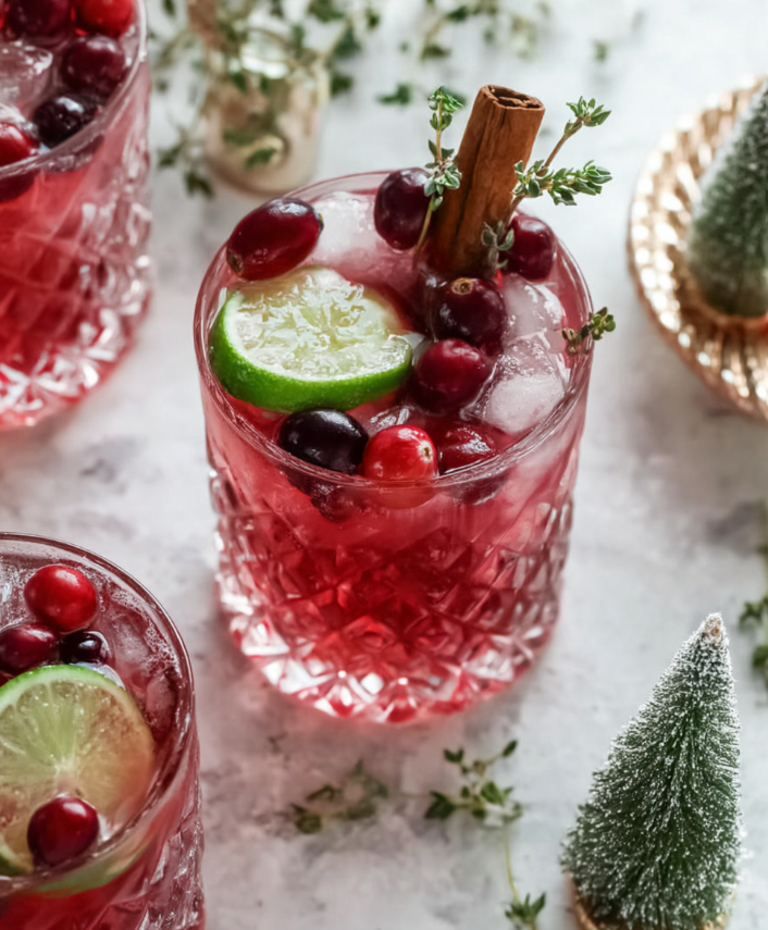 - Finish with garnishes. Sprinkle in fresh cranberries and float thyme or rosemary sprigs on top.