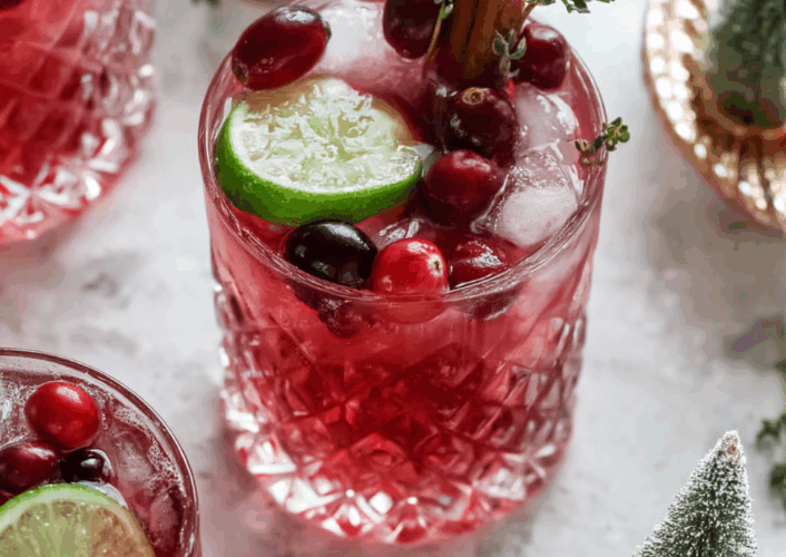 Try sugared cranberries, edible glitter ice cubes, or glass rims dipped in sugar and lime zest.