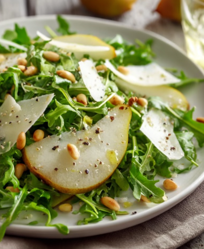 This Pear and Arugula Salad with Honey Vinaigrette combines crisp pears, creamy goat cheese, and toasted walnuts in a zesty dressing — ready in just 10 minutes!