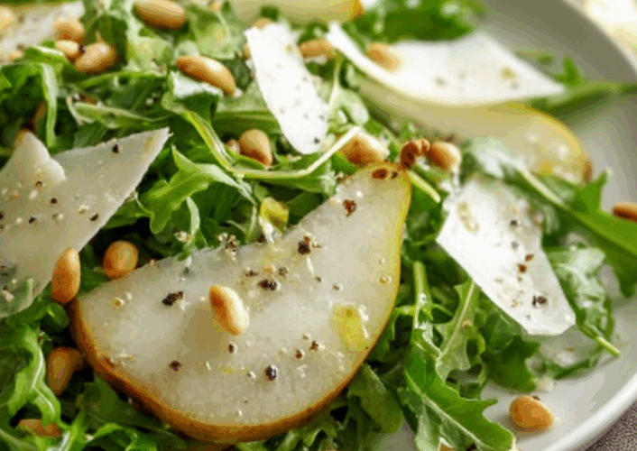 This Pear and Arugula Salad with Honey Vinaigrette combines crisp pears, creamy goat cheese, and toasted walnuts in a zesty dressing — ready in just 10 minutes!