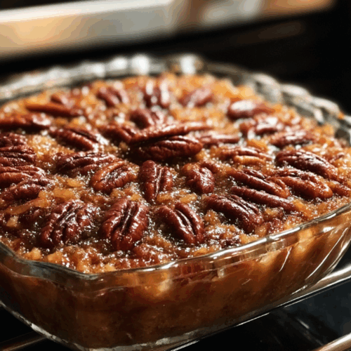 It’s everything you love about the classic Southern pie sweet, sticky filling and crunchy pecans layered with buttery cake mix that practically melts into caramelized perfection. The best part? No mixer, no fancy steps. You literally dump it, bake it, and try not to eat half the pan before it cools.