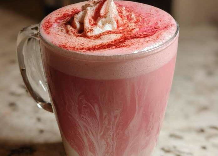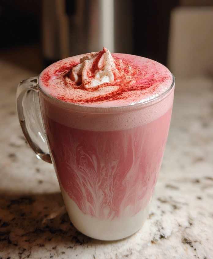 The pink milk base can be prepared ahead and stored in an airtight container in the refrigerator for up to 2 days. Reheat gently on the stovetop and froth again before adding espresso. For best flavor and texture, assemble fresh.