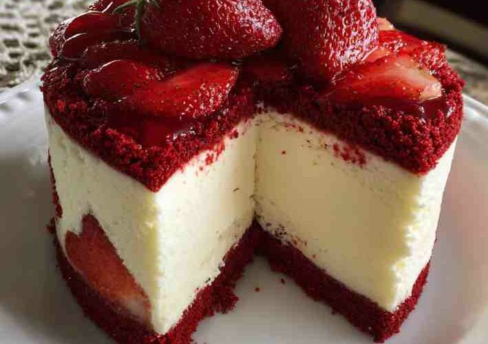 If you’re searching for a dessert that turns heads before the first bite is ever taken, this Red Velvet Strawberry Cheesecake is the one. With its bold red velvet base, ultra-creamy cheesecake center, and glossy fresh strawberry topping, every slice delivers elegance, flavor, and a little bit of drama.