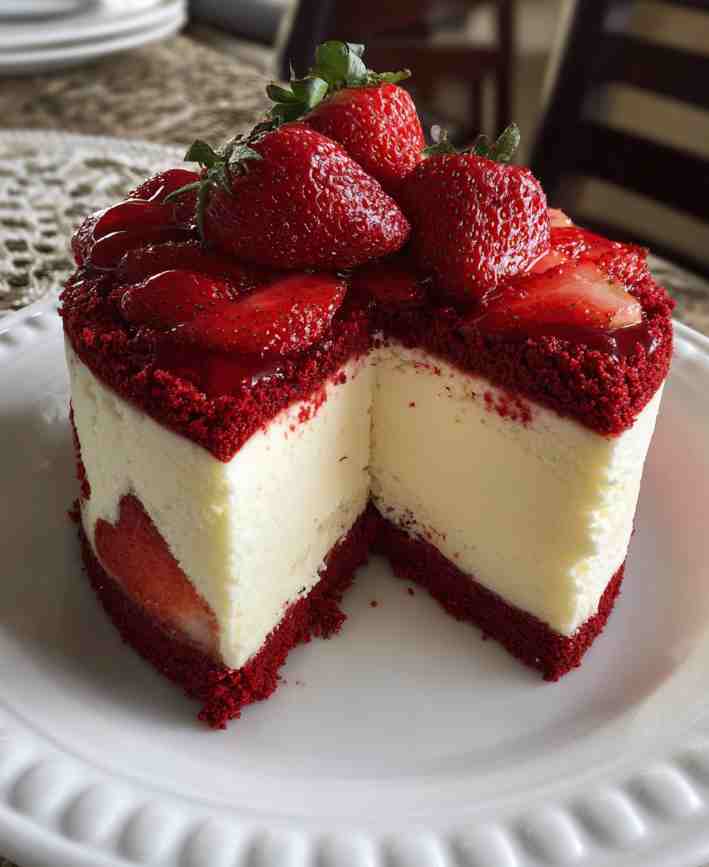 A stunning dessert that layers moist red velvet cake with silky cheesecake and a vibrant strawberry topping—perfect for any celebration.