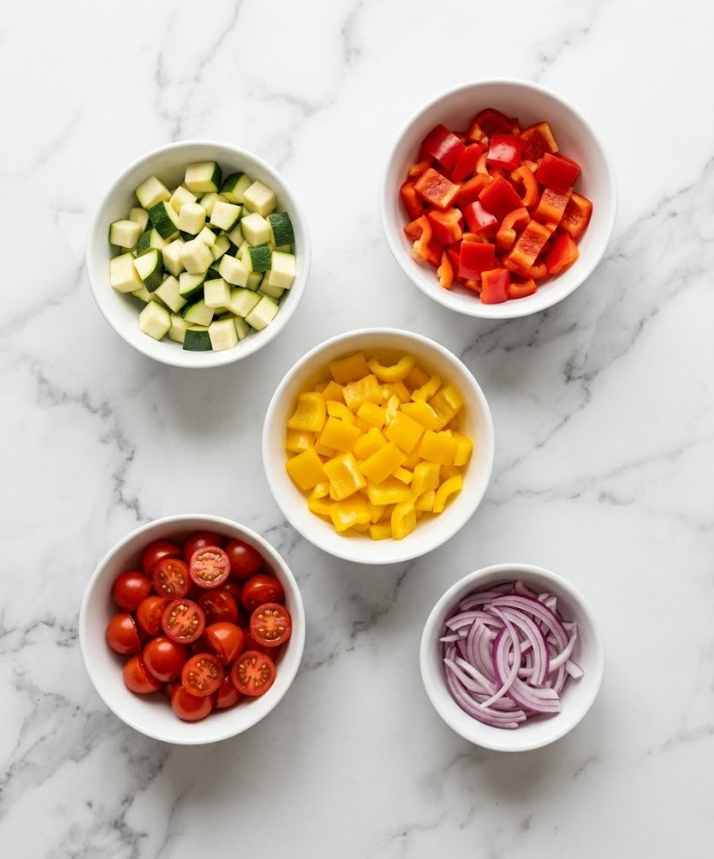 - Roast the VegetablesIn a mixing bowl, toss the zucchini, peppers, cherry tomatoes, and red onion with olive oil, Italian herbs, salt, and pepper. Spread them out on your baking sheet in a single layer.Roast for 20–25 minutes, stirring once halfway through, until the veggies are tender and slightly caramelized around the edges. The tomatoes should be juicy and blistered — that’s where the flavor builds.