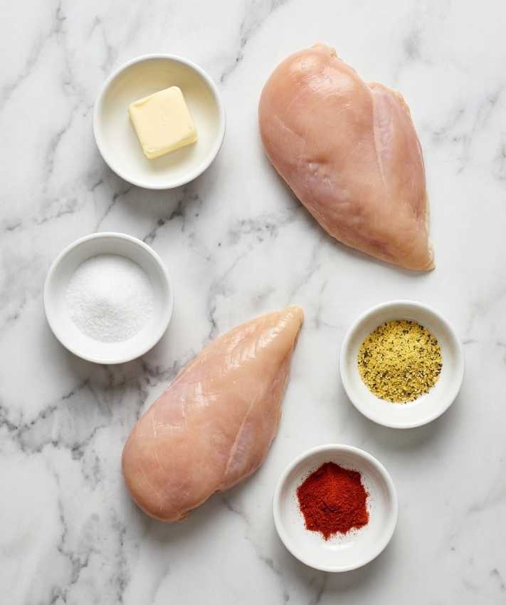 • Season chicken with salt, lemon pepper, and paprika. Place in dish, flat side down. Bake 15–20 minutes.
