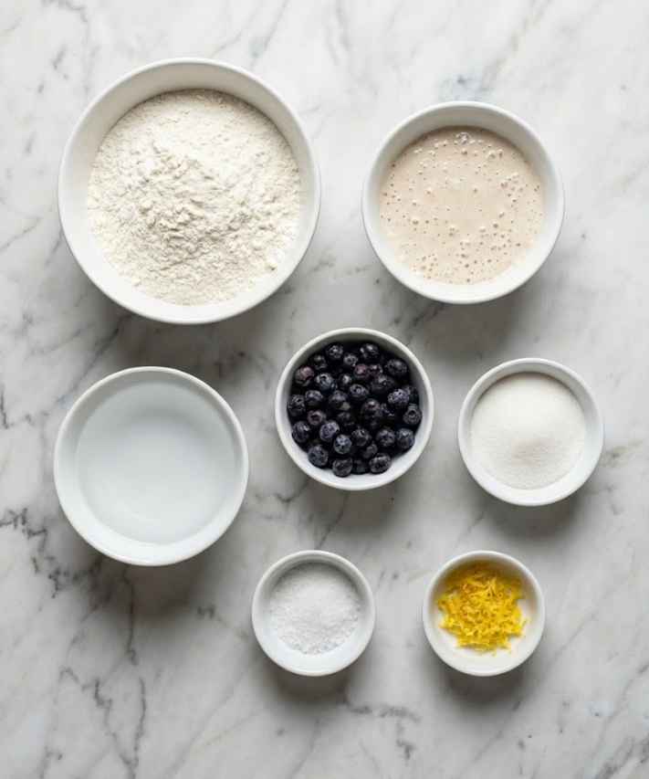 • In a mixing bowl, combine the active sourdough starter, water, bread flour, sugar, lemon zest, and salt until a rough dough forms.