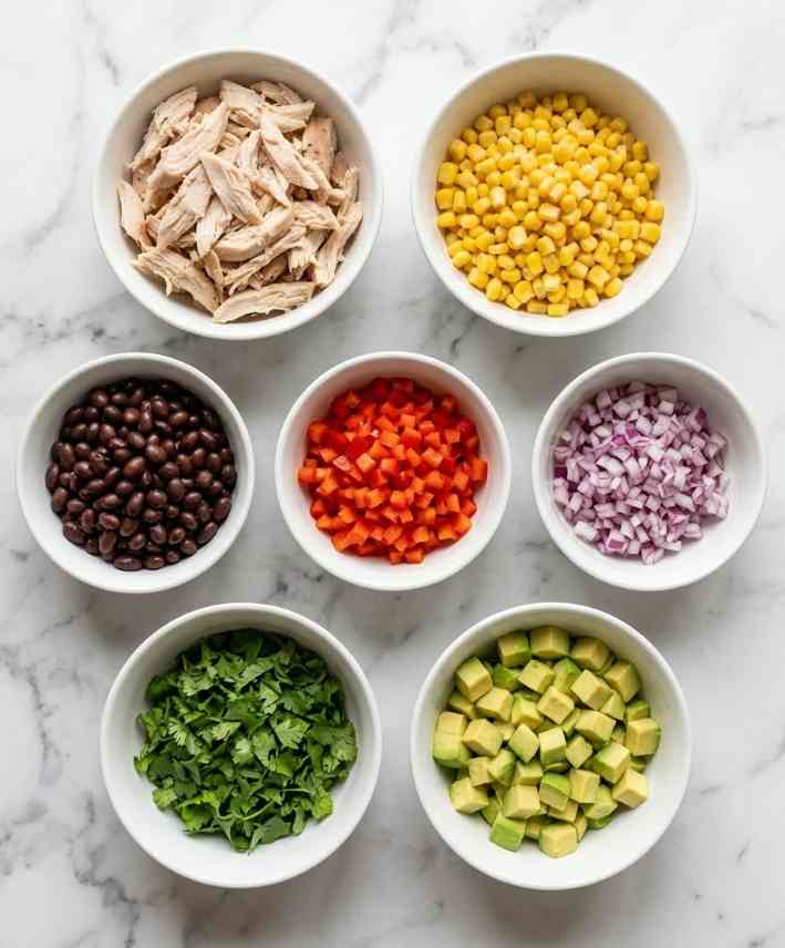 • Mix the Base:In a large bowl, combine the chicken, corn, black beans, red bell pepper, red onion, and cilantro. Toss gently to mix.
