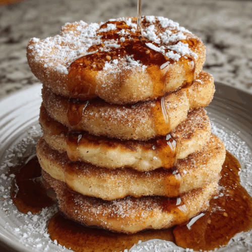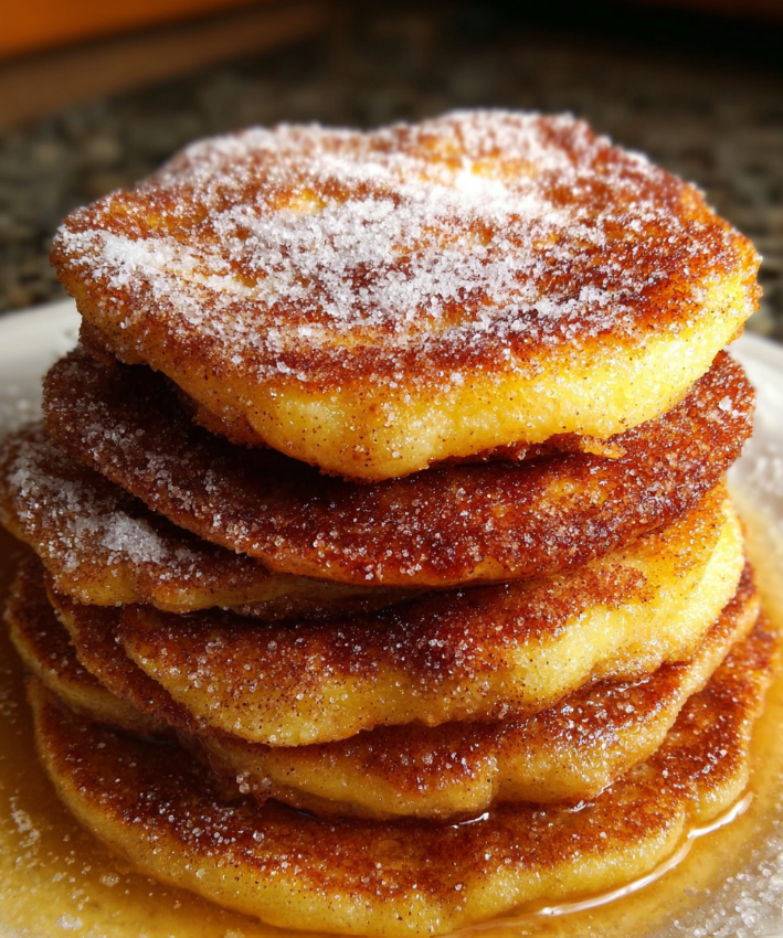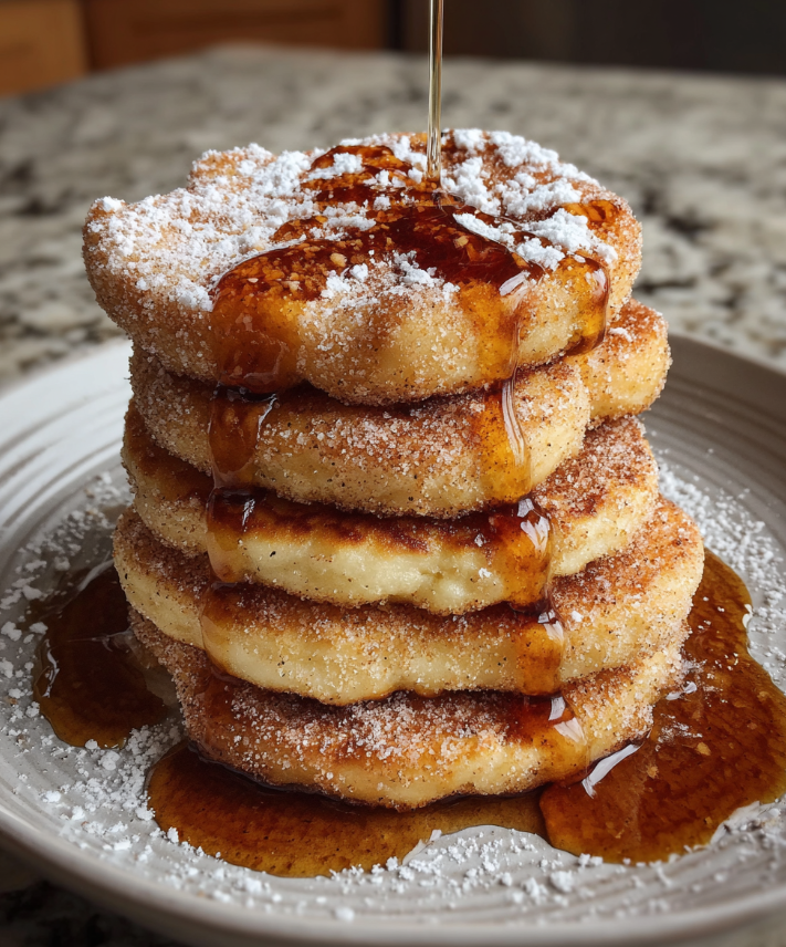 While still warm, sprinkle each pancake generously with cinnamon sugar. The heat will slightly melt the sugar, forming that nostalgic churro-like crust. Stack, serve, and inhale deeply — this is what weekend mornings were made for.