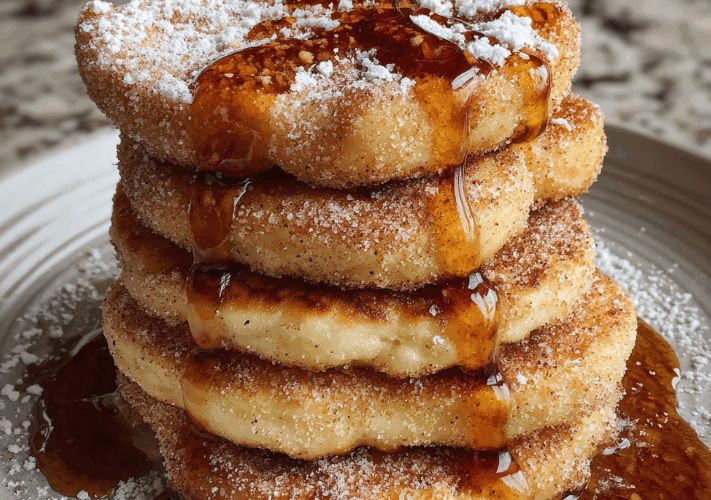 While still warm, sprinkle each pancake generously with cinnamon sugar. The heat will slightly melt the sugar, forming that nostalgic churro-like crust. Stack, serve, and inhale deeply — this is what weekend mornings were made for.
