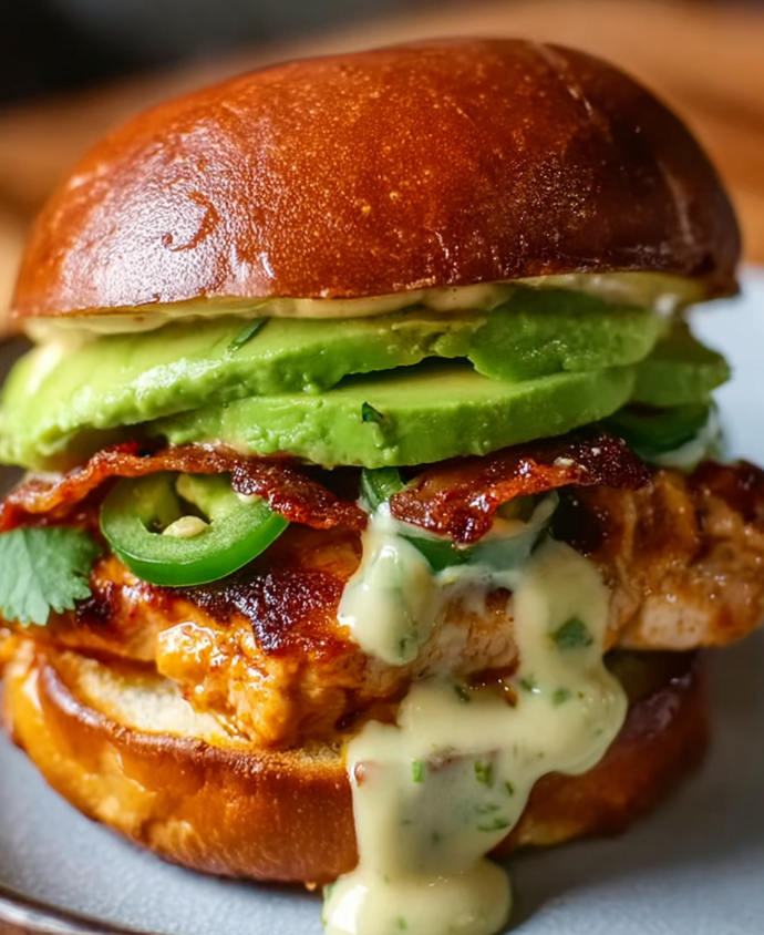 - Assemble the Sandwich: Spread chipotle mayo on both halves of each bun. Add sliced avocado, grilled chicken with melted cheese, bacon strips, and pickled jalapeños.
