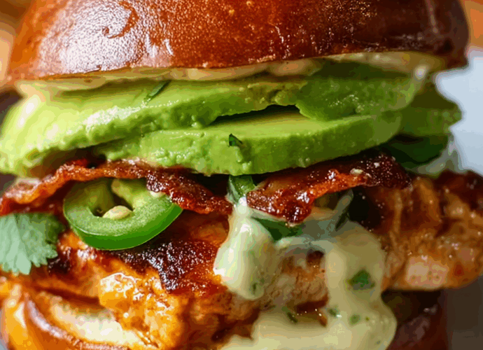 - Assemble the Sandwich: Spread chipotle mayo on both halves of each bun. Add sliced avocado, grilled chicken with melted cheese, bacon strips, and pickled jalapeños.