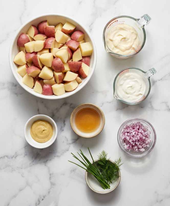 Add cubed red potatoes to a large pot and cover with cold water. Bring to a boil and cook for 10–15 minutes until fork-tender. Drain and cool completely. - Prepare the Dressing