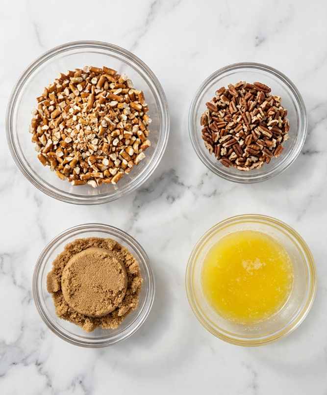 - In a bowl, mix crushed pretzels, chopped pecans, and brown sugar. Stir in melted butter until evenly coated.