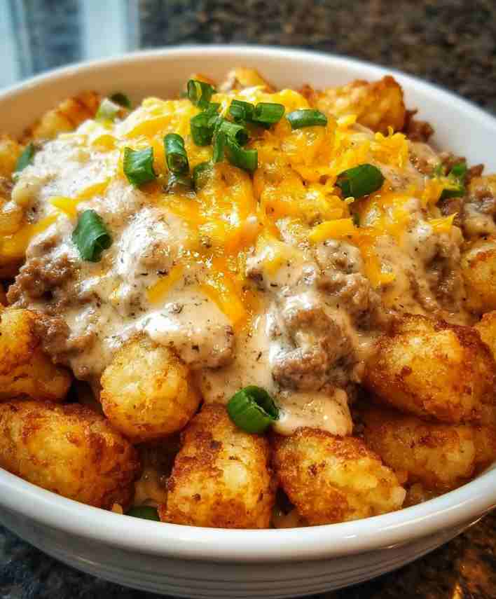Bake the tater tots until deeply golden so they stay crisp under the gravy. Whisk constantly when adding milk to avoid lumps, and cook eggs last for the freshest texture.