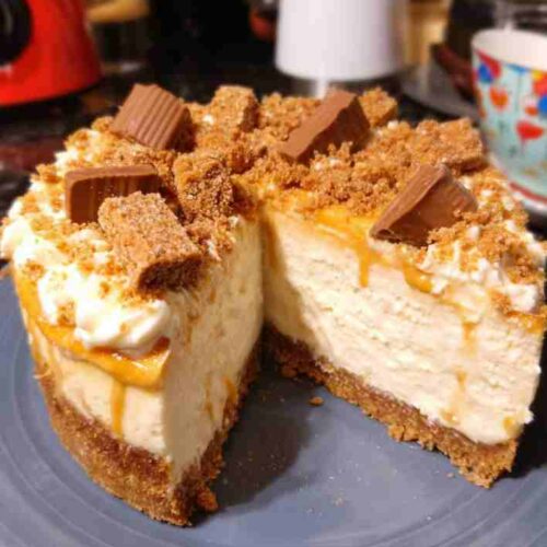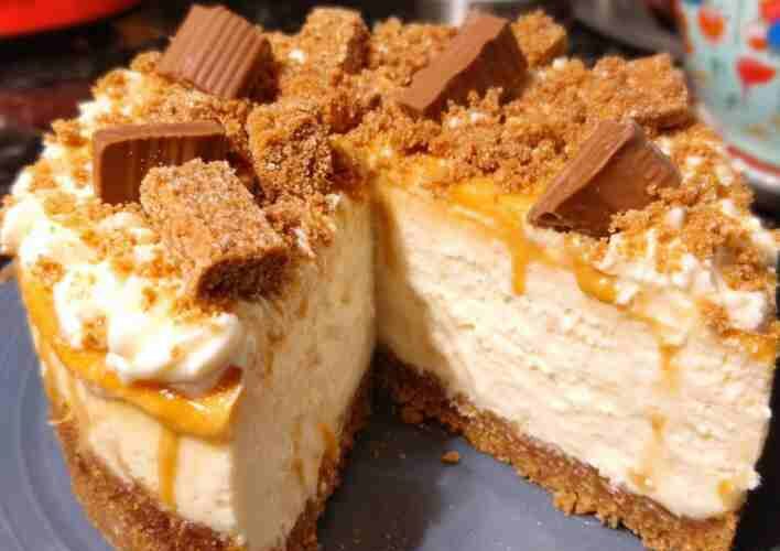 - Mix peanut butter and heavy cream until smooth. Pipe over the chilled cheesecake and garnish with cookies and toffee pieces.